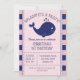 Inbjudan dina gäster i stil till dina döttrar 1:a födelsedag party. Den här nautiska inspirerade designen har rosa och marin blå strimlad bakgrund med en söt blå val med stjärnor som kommer ut ur spalten. Ord ovanför valvalen stod "Stänk! Det är A Party!" Nedan visas ditt barns namn och dina party-uppgifter så att du kan anpassa dig. Kortets baksida matchar rosa och marinblått rand. Perfekt för första födelsedagar eller byte till det år du väljer.