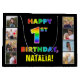 Den här presentsäcksdesignen för öga och den glatta födelsedagspressen innehåller meddelandet "LYCKLIG 1ST BIRTHDAY", med ett dynamiskt multifärgat regnbågsspektrum som inspirerar övertoningen mönster, tillsammans med en redigerbar mottagare namn. Till lämnat och högerna på det regnbågsmönstrade meddelandet på framsidan finns några foton som kan vara personliger, kanske med foton på mottagaren, mottagarens familj och vänner och/eller presentens avsändare. En munter matsäck som den här kan vara en roligt för att slå en present till någon som firar sin första födelsedag. (Photography © Storytree Studios, Stanford, CA.) [~Z0000668]