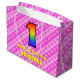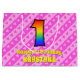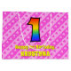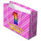 Den roliga och roligt 1:a födelsedagskalematerade presentsäcksdesignen har ett stort nummer "1" med ett mönster inspirerat av ett regnbågsspektrum. Det innehåller också budskapet "Lycklig 1:a födelsedag", följt av en personlig namn. Bakgrunden har en rosa i mörk och ett mönster i ljusa rosa rand som innehåller levande hjärtformer i rosa. Sådana presentsäckar kan användas när man slår in presenter eller ger gåvor till någon som firar sin första födelsedag. [~Z0000414]