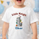 Denna anpassade födelsedags-t-shirt för ettåringar har siffran "1" utformad som ett robust stentorn på en borg, komplett med kreneleringar, flaggor och baner med medeltida kors. En söt liten bepansrad riddare står redo bredvid borgen med svärd och sköld.