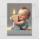 Bilden föreställer en bebis pojkes första födelsedag. Bebisen kramar ett brinnande ljus för att fira sitt första år i livet. Pojken visar en stor leende. Låt oss göra den här festen oförglömlig.