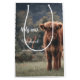 Högre landkalvmonogram första födelsedagsfesten. Den unga kalven av höstskotska nötkreatur på höstgrassi fält med muterat färg. Vackra orangar i mörk jackar kontrastera med lätt gräs i gult och träd i bakgrunden. Anpassningsbarnas anpassningsbara monogram med ditt namn och första på den lämnat. Allt för ditt barns första födelsedag, inbjudningar, pappra tallrikar, kopp och mycket annat.