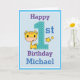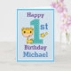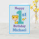 En blå etta dekorerad med ljusblå prickar. En söt glad gul giraff med ett lyckligt leende. Nedan finns en textmall för att lägga till födelsedagsbarnets namn.