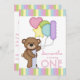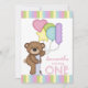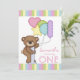 En söt inbjudan till en flickas första födelsedag med en söt illustration av en björnhake på ett nummer ett och ballonger. Ballongens form är ett hjärta, en stjärna och cirklar i kärlek i rosa, gult, grönt, blått och lila. En roligt gräns i pastellregnbåge färger som matchar färgerna för ballongens funktion överst och grund i inbjudan. Anpassa texten för att skapa de sötaste inbjudningarna till din flicka 1st Birthday party. Om du behöver hjälp med din anpassning kan du kontakta oss via vår GiftsBonanza-butik. Denna design skapades delvis med grafik som köpts med en kommersiell licens från www.realdealclipart.com