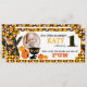 Svart katt omgiven av pumpor med bakgrundsutskrift i candy corn och trim i rand med 3D-utseende svart och orange-polka-punktsbågdesign för den första Halloween-födelsedagen.