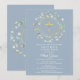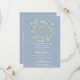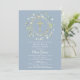 En dekorativ grönskekrans och guldkors sitter ovanför din speciella första heliga kommunion save the date-information på en dammig blå bakgrund.