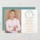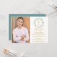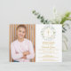 En dekorativ gröngarland och guld kor sitter ovanför din speciella gemensamma händelseinformation för första heligan och speciella foto på den här eleganten. Det omvända har en passande lagergarland och kor. Designad av Thisisnotme©