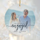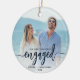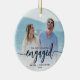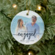 Minneshögtidlighålla din förlovning med denna vackra, moderna keepsaksprydnad. Den blå texten från flottan lyder "Vår första jul förlovad", med ord försatt i ett fet handskriftsskript med blommor före och efter. Ersätt exempelbilden med ditt favoritfoto och lägg till namnen och året. Ett vitt övertoningsfilter hjälper till att göra så att texten visas.