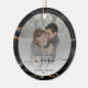 Minneshögtidlighålla din förlovning med denna vackra, moderna keepsakefotoprydnad. Den svarta texten lyder "Vår första jul förlovad", med ord "förlovad" i skript för elegant med blommor före och efter. Gräns har en svart vattenfärgsagatdesign som trimmas med guld faux glitter. Ersätt exempelbilden med ditt favoritfoto och lägg till namnen och året. Ett vitt övertoningsfilter hjälper till att göra så att texten visas.