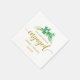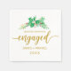 Den här elegantens pappra napkin är perfekt för helgdag och förlovningsfester. Utformningen har en vattenfärgsspiral med grönt löv och röda bär. Nedan står faux guld typografi som lyder "Vår första jul engagerad" med namn och år för att anpassa sig. Designad av konstnären ©Susan Coffey.