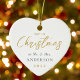 Anpassningsbar-designad hjärtformad keramisk julprydnad med modern kalligrafi i guld "Vår första jul"-design. Anpassa med fotot, namn och datum från bröllop.