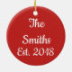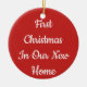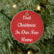 Röd klassiker och prydnad för vitjulanpassade med "första jul i vårt nya hem" på bekläda och "______'snas est. 2018" på baksidaen