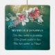 Den första jul då keramiska prydnadsföremål av keramiskt ursprung i personlig skisserar en elegant vinter, blommigt av julens helgdag med skönheten hos vattenfärgade frusna röda bär och delikat mjuk sage grönt löv och evergreens mot bakgrund av guld och bröllop mörk grönt. Det visar parets namn och datum. Bakåtinspirerande citat: "Två lever enade i vänskap, två vänner förenade i kärlek, One kärlek förenade i Kristus."