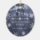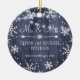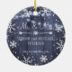 Första julen höll Mr. och Mrs. elegant personlig kvar träd ornament med snöflingor och vit hängsträng ljus på en mörk marin blå ladugårdbakgrund. ++++++++++ A-söt keepsakpresenter för nyfödda.