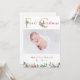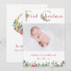 Lägg till ditt barns foto i detta julkort för första julen för att skapa en bestående souvenir för familj och vänner. Framsidan innehåller ditt barns bild, med texten: Första julen högst upp och texten: Barnets namn och Födelsedag längst ned, med en dekorativ blommig ram. Baksidan innehåller texten: God Jul, tillsammans med texten: Er familjs namn och familjemedlemmarnas namn. För att anpassa, lägg bara in din favoritbild och klicka på "Anpassa storlek" för att centrera. Lägg därefter in din text i vår enkla mall och ersätt exemptexten.