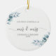 Elegant grenar av vinterblad i isblått och målat i vattenfärg ger en känslig dekoration för denna känsliga och snyggt julprydnad för ett nyfött par med titeln "Vår första jul som Mr. och Mrs.". Modern, enkel och elegant.