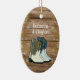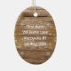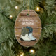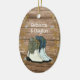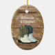 En Julgran-dekoration för par som firar en första jul tillsammans. Rustic, stil med träskivor och handdragna cowboyskor och cowboystövlar från land. Båda sidor av den ovalformade keramiska prydnadsprodukten har gräns i guld snöflingor. Ljud, anpassningsbar text på båda sidor i vitt, skuggteckensnitt. Inkludera namn och datum samt det första adress-hemmet på baksidan, eller gör ditt eget sak!