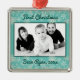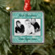 Blå grönt fotodekoration för en nyfödd bebis-pojkes första jul. Fyrkant, metall-ornament, med rött band att hänga, har vågrät fotomall och mörk tealblått text i två ställe. Den blå bakgrunden har snöflingor-design överst och grund. Den djärva manustexten har en ställe för "första jul" överst och namn med årsdatum i grund. Utformningen gjordes för detta dekorativa stil, men kan passa andra former och stilar, även om utformningen endast kommer att finnas på ena sidan.