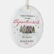 Den första julen i vår nya lägenhet, monogram keramiskt prydnadsämne. Fira din första jul i din nya vackra lägenhet med en söt anpassningsbar helgdag med ett sött byggnad omgivet av träd. Anpassa den genom att byta år och din familj namn.