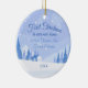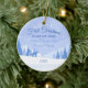 Denna vackra nya julprydnad i anpassningsbarna är personlig med adress och år i elegant blå kursiv typografi över ett landskap teckning i en vinterstad som är täckt i snö och omgiven av söt fir träd. Cute helgdag nuförtiden och gåva till husuppvärmning. Första jul i vårt nya hem.