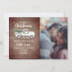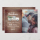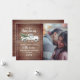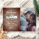 "Vår första jul som herr och fru" text med illustration av en gammal vit lastbil dekorerad med grönska och röda bär som drar en färsk julgran. Bakgrunden är inspirerad av trä med anpassad vit text och ram. Anpassa fotot till höger.