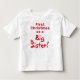 Första julen syskon T-shirt-design har frasen "Första julen som stor syster!" i röda bokstäver. En tomtehatt visas på kanten av bokstaven "S" för syster, och en julkrans hänger lekfullt på slutet av ordet jul. Små gröna och röda prickar visas genom hela. Designad för att komplettera "Första julen"-kollektionen.