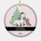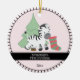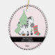 Baby zebra med röd/grönt, julstrumpor och grönt träd i bakgrunden. Ljus rosa bakgrund för ett flicka. Svart banderoll och strimlad gräns kring ornament. Mallen skapades åt dig. Perfekt för nya föräldrar att fira första barnet vid jul!