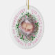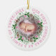Vår första kristas är en familj av tre rosa fotokeramiska prydnadsföremål för krans i flicka. I denna festliga utformning visas ett foto av det nyfödda baby i en julkrans ram och texten: "VÅR FÖRSTA CHRISTMAS AS A FAMILY OF 3.20XX" i rosa.
