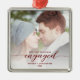 Minneshögtidlighålla din förlovning med denna vackra, moderna keepsaksprydnad. Den brinnande röda texten lyder: "Vår första jul förlovad", med ord "försatt" i elegantens kalligrafi med dekorativa slagord före och efter. Ersätt exempelbilden med ditt favoritfoto och lägg till namnen och året. Ett vitt övertoningsfilter hjälper till att göra så att texten visas.