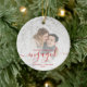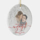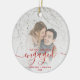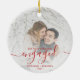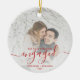 Minneshögtidlighålla din förlovning med denna vackra, moderna keepsaksprydnad. Den röda texten lyder "Vår första jul förlovad", med ord "förlovad" i handskriftsskript för elegant med blomning före och efter. Ersätt exempelbilden med ditt favoritfoto och lägg till namnen och året. Ett vitt övertoningsfilter hjälper till att göra så att texten visas.