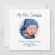 Modern hälsningskort för första julen, med ett sött pojke-tema och anpassadets blå typografiklämtning. Med en fotomall ersätter du med ditt eget baby-foto. Underbaren för att du ska lägga till det här till dina kära i julhelgen.