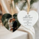 Hjärtformad "Vår första julgift"-fotodekoration är en romantisk och sentimental keepé, en perfekt för att hedra minnet av ett pars första julhelg som nygifta. Framsidan har elegant svart text i en blandning av snyggt skript och förfinat serif typsnitt på en mjuk vit keramisk bakgrund, accentuerad med ett känsligt svart hjärta för tillsatt charm. Baksidan visar ett foto av fullt, perfekt för att markera ett porträtt eller speciellt ögonblick i bröllop. Detta vackert utformade prydnadsföremål är designat för att fira kärlek och giftermål med värme och elegans, skapar det till en tänkvärd gåva eller omhuldad dekoration.