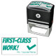 Den här inspirerande gummidesignen i frimärke innehåller det inspirerande återkopplingsmeddelandet "FÖRST-CLASS WORK!" och personligens lärares namn. Den innehåller också en dekorativ bock. Det skulle kunna användas av en skollärare, lärare, instruktör eller lärare när de markerar uppdrag för att erkänna att student har gjort bra ifrån sig.