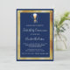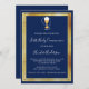 En modern elegant och inbjudan. En marin blå bakgrund som dekoreras med schalice och en värd, faux guld ramar. Anpassa och lägg till namn och detaljer. Vit text.