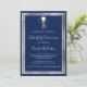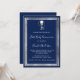 En modern elegant och inbjudan. En marin blå bakgrund som dekoreras med schalice och en värd, faux silver ramar. Anpassa och lägg till namn och detaljer. Vit text.