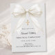 Bjud in gäster med denna sofistikerade inbjudan till första heliga kommunion. Designen har en lyxig elfenbensfärgad satinbåge draperad med ömtåliga pärlor och ett glänsande guldkors mot en mjuk duvgrå bakgrund. Det är ett vackert val för en ung flicka som firar sitt heliga katolska sakrament.