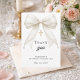 Ett modernt och elegant tackkort för första kommunion. En vit bakgrund, dekorerad med en stor elfenbensfärgad båge med pärlor och ett förgyllt kors. På framsidan texten: Tack, namn och datum.
