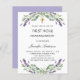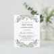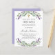 En vit bakgrund dekorerad med lila blommor och eukalyptusgrönska. Anpassa med namn och detaljer.