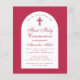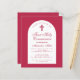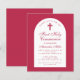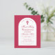 En inbjudan till en flickas första kommunion. I en modern färg mellan magenta och rött har den en vit båge med magenta röd text inuti. Tillfället och namnet skrivs i ett elegant kalligrafiskt manus; den första raden är välvd text.