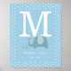 Söt initial monogram barnkammareaffisch med ditt barns namn och året de kom till, med söta prickiga föräldra- och babyelefanter. En fin souvenir att minnas!