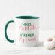 Här är en mugg för Mamma på Mors dag som kommer att dra vid hennes hjärtslitande! Texten på två sidor är i mjuk grönt och rosa och säger "First My Mor, Forever My Friend". Din anpassningsbar finns på mitten i fyra som är lätta att byta fält, så du kan också göra det till en födelsedagspresent. Hon kommer att ta hand om det!