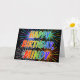 Det här flerfärgade kortet för hälsning på roligten och födelsedag innehåller meddelandet "GRATTIS PÅ FÖDELSEDAGEN" och det vanliga första "MINDY" för namn, där brev har ett färgstarkt regnbågsspektrum som färggradientfärgning mönster. Bakgrunden till framsidan har också en färgstark sprängning av fyrverkerier som inspirerat mönster. Insidan innehåller ett anpassade hälsning-meddelande, eller så kan det kanske rensas och lämnas tomt om ett meddelande ska skrivas för hand i stället. Ett sådant här födelsedagskalkokort kan vara ett roligt för att erkänna att någon vid namn Mindy fyller år. [~Z0000350]