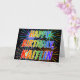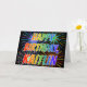 Det här flerfärgade kortet för hälsning på roligten och på födelsedag innehåller meddelandet "GRATTIS PÅ FÖDELSEDAGEN" och det vanliga första namn "KAITLIN", där brev har ett färgstarkt regnbågsspektrum som övertoningsfärgning mönster. Bakgrunden till framsidan har också en färgstark mönster som inspirerats av att det ser ut som om man sprider berömda fyrverkerier. Insidan innehåller ett anpassade hälsning-meddelande, eller så kan det kanske rensas och lämnas tomt om ett meddelande ska skrivas för hand i stället. Ett hälsningskort som detta kan vara ett sätt att fira roligtens födelsedag för någon som heter Kaitlin. [~Z0000350]