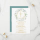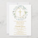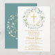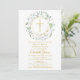 En dekorativ grönskrensa och guldkors sitter ovanför din speciella första heliga kommunion "spara datum"-information i denna eleganta design.