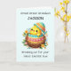 Fira din underbara-underbara barnsons allra första Påsk med ett personlig kort bara för honom! En söt chick kläcks från sin snäcka, omgiven av starkt vår blommor, mot en mjuk pastellbakgrund som förstärker säsongens värme. Hans namn på framsidan gör detta kort ännu mer speciellt och skapar en vänskaplig keepy för sin milstolpe först i Påsk. Med kärlek och glädje är detta ett hjärtligt sätt att fira sin första helgdag på ett verkligt personligt sätt!