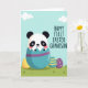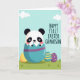 Designad med en söt vårscen, har detta kort en runt ansiktad baby-djur med svarta fläckar runt ögonen och öronen, som tittar ut från en stor äggskal som om den just anlände till en första firande 🐰. Det lilla varelseens mjuka rosa kinder och milda, framåtlutande ställning ger den ett tillgiven, nästan gulligt utseende. Den överdimensionerade skalet är teal med ett brett lila band, som sitter lågt i en gräsbevuxen förgrund som känns fräsch och välkomnande. Runt omkring den vilar mindre dekorerade ägg i soligt gult, randigt teal och prickigt lila i gräset som om de placerats där för en delad familjemoment 🌷. En ljusblå himmel sträcker sig bakom allt, prickad med luddiga vita moln som håller scenen lugn och ljus. På höger sida står texten “GRATTIS PÅ FÖRSTA PÅSKEN BARNBARNSBARN” med versaler