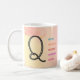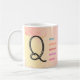Mugg kommer att vara en favorit för alla från din mormor till din tonårssyster. Med högernas budskap kan ett mugg bli någons skattade följeslagare till komen i åratal. Den här designen har en vacker, handritad "Q" från brev i svart kursiv stil på en fantastisk vattenfärgsbakgrund. Den lämnat sidan visar en varm övertoning mellan gult och rosa, medan högerna visningar en mjuk övertoning mellan rosa och gult. Området kring brev är vibrerande ord i olika färg, inklusive blått, orange, rött, lila och rosa, vilket belyser de positiva egenskaperna från brev "Q". Den övergripande effekten är en visuellt tilltalande och upplyftande design som firar skönheten hos brev "Q" och dess egenskaper. Vattenfärgsbakgrunden tillför en smula elegans och sofistikering och skapar den här perfekten för inspiration eller motivation.