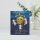Första resa runt sol första födelsedagsfest inbjudan-mallen med söt, rolig nalle i en hjälm som flyger i rymden på celestial himlar.