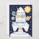 Rymden 1:a födelsedagsinbjudan har söta planeter och stjärnor. Den här designen är perfekt för någon som har en rymdtematisk födelsedagsfest.