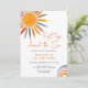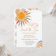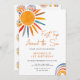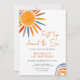 Planerar du en pojkes första födelsedagsfest? Denna färgstarka inbjudan är dekorerad med en vattenfärg sol och en regnbåge. Det står "Första Resa runt Sol" i snyggtens typografi. Enkelt anpassade. Ursprunglig vattenfärg © Michele Davies.